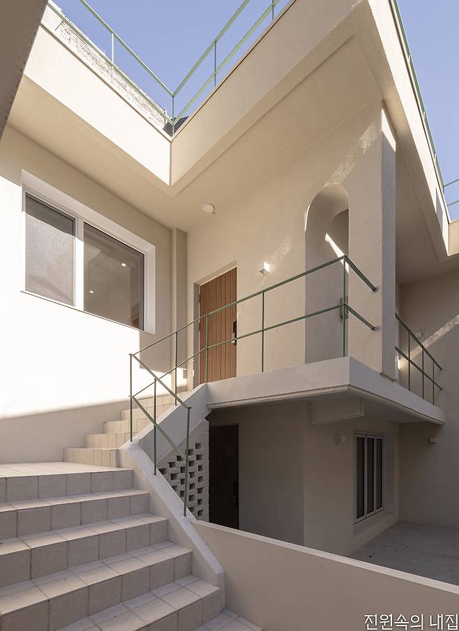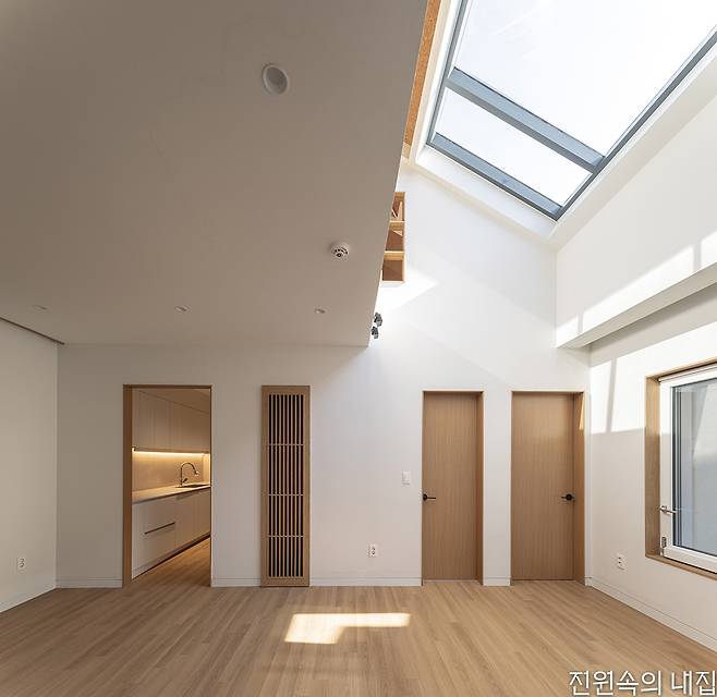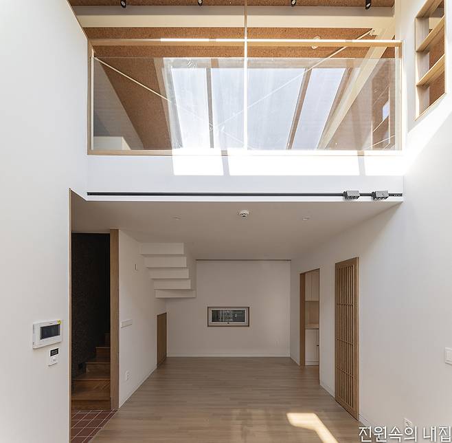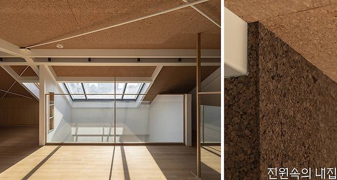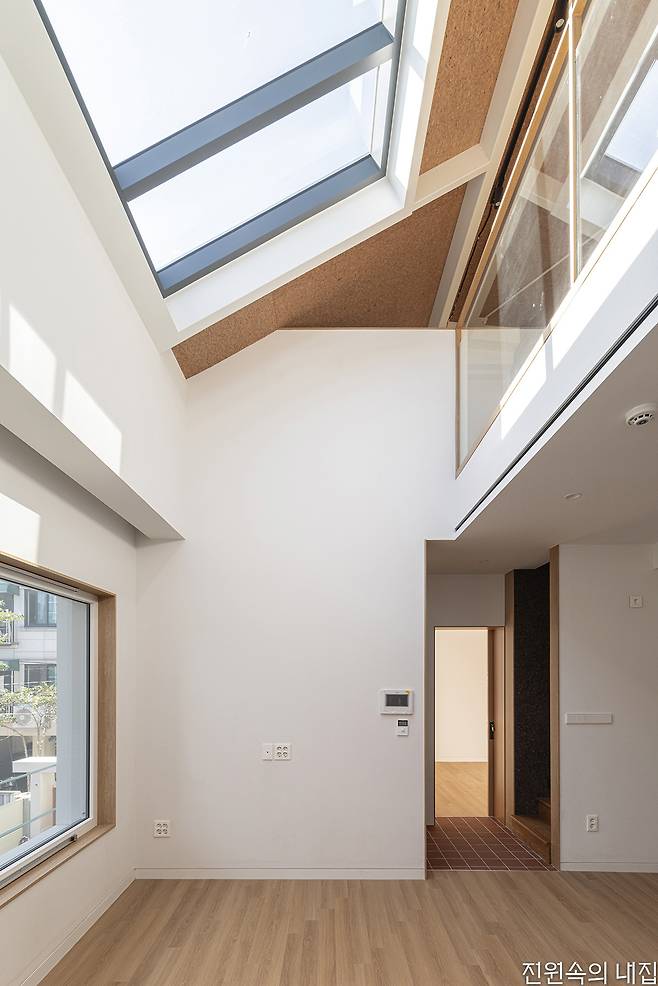주택은 이를 위해 구조에서는 1, 2층을 전부 철골조로 구조 틀을 만들어 보강했다. 1층은 상업 공간으로의 전환을 생각하고 있어 1층과 2층으로 향하는 동선에 뚜렷한 구분을 만들었다. 2층은 불필요했던 공간을 정리하고 각 실의 크기를 늘려 쓰임새를 넓혔다. 2층 천장은 오픈해 다락과 연결점을 만들고 지붕창을 얹었다. 지붕을 철거할 때 골조 틈새로 들어온 햇빛에 아이디어를 얹은 부분이었다. 2층 주거공간의 톤을 정할 때, 건축주는 원하는 것보다 원치 않는 것을 꼽았다. ‘현대적’, ‘세련된’, ‘모던함’이 그것이었다. 덕분에 집은 베이지 톤의 도장과 벽지, 우드 시트가 베이스가 되어 은은한 붉은 톤의 테라코타 타일, 다락 천장의 코르크 판재를 포인트로 인테리어가 정리되었다. 여기에 지붕창의 풍부한 채광과 함께 집 전반에는 따뜻함이 깃들었다.
