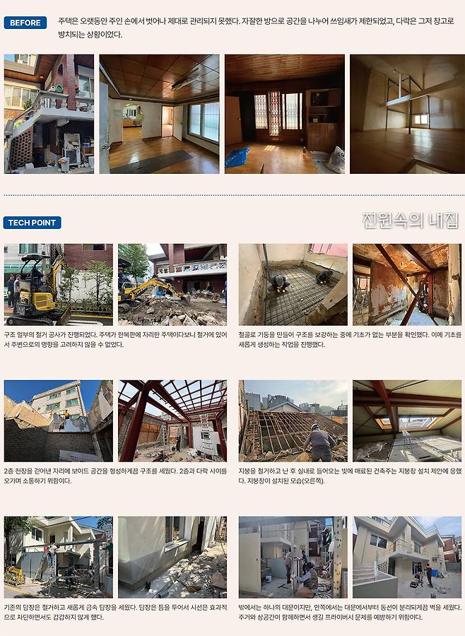 한편, 건축가는 대수선에 대한 당부로 건축가와 건축주의 소통을 강조했다. 대수선의 경우 일부 철거하는 과정에서 새로운 문제점을 발견하는 등의 돌발변수가 생기기 마련인데, 이 과정에서 소통과 대처 능력이 중요하다는 것. 이 현장에서도 철거 중 기초가 누락된 부분이 발견되기도 해 긴급하게 보강이 이뤄지기도 했다.