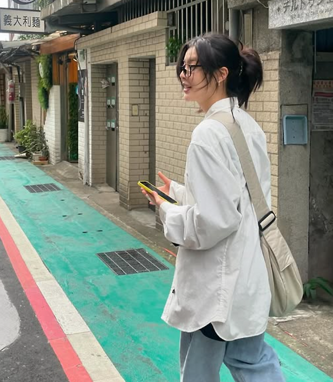 이선빈이 선택한 첫 번째 여행룩은 베이식한 화이트 셔츠와 데님 청바지 조합이에요. 화이트 셔츠는 누구나 하나쯤 가지고 있는 기본 아이템이지만, 오버핏으로 선택하면 더욱 자연스럽고 여유로운 분위기를 연출할 수 있어요. 청바지와 매치하면 깔끔하면서도 시크한 무드가 완성됩니다.