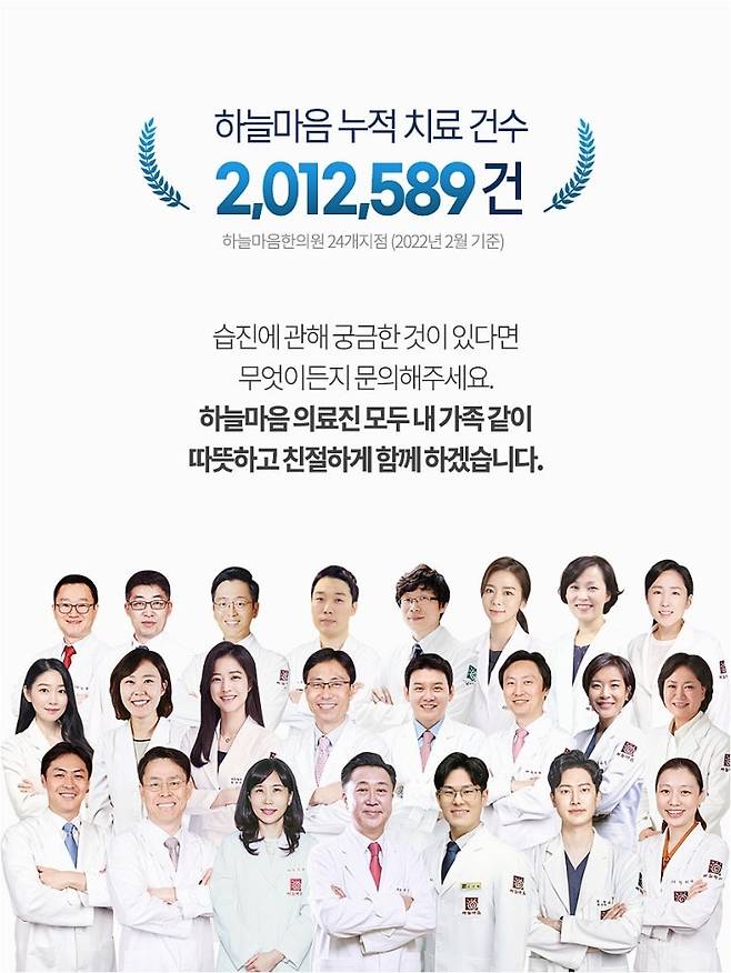 범어동습진은 완치가 쉽지 않은 만성 피부 질환입니다. 하지만 포기하지 않고 꾸준히 관리하고 노력한다면 충분히 증상을 개선하고 건강한 피부를 유지할 수 있습니다. 하늘마음한의원에서는 치료 종료 후에도 재발 방지를 돕기 위해 행복주치의 제도를 운용하고 있으니 적극적으로 활용하시길 바랍니다.