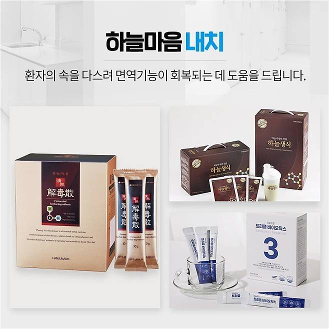 하늘마음에서는 4중 코팅 유산균 식품과 프럭토올리고당 섭취를 권장하며, 몸에 좋은 영양소가 함유된 생식도 함께 섭취하는 것을 제안합니다.