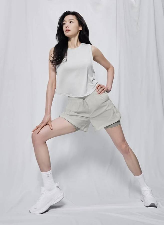 전지현은 최근 애슬레저 브랜드와 함께한 2025년 S/S 컬렉션 화보에서 그 동안 운동으로 다져진 군살 제로의 탄탄한 몸매를 드러냈다.