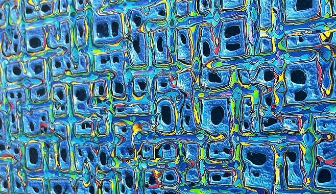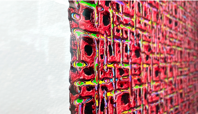 가까이에서 보면, 마치 벌집 혹은 회로 같다. 이 무한한 연결성으로 견고한 구조감이 느껴지는 작품, 김태호 작가의 내재율(Internal Rhyrhm)이다. 한 색 또는 같은 계열의 색조로 형상화 하는 작업, ‘단색화(모노크롬)’. 김태호 작가는 박서보, 이우환 작가의 계보를 잇는다. 1995년부터 꾸준히 발표해온 내재율 시리즈는 캔버스에 연필로 작은 격자무늬를 그리고, 그 위에 20여 개 물감 층을 밀도 높게 쌓아 올린다. 캔버스 위에 물감을 얹고 말리고, 마르면 다시 올리기를 반복. 작가는 최종적인 순간엔 쌓아 올린 색의 표면을 돌연 깎아 내기 시작한다. 수평과 수직으로 특수 제작된 조각칼이 지나간 자리엔 켜켜이 쌓인 물감의 색이 더 선명하게 드러난다. 쌓고 깎아 내림으로서 더 다채롭게 색감을 드러내는 것. 이것이 김태호 작가의 기법, 마띠에르이다.