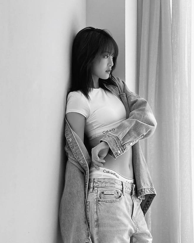 하얗게 비친 벽과 녹음이 짙은 관엽식물, 그 틈에 선 민니의 모습이 한 폭의 여름 화보처럼 다가온다. 자연광이 닿은 실내, 단순하지만 절제된 공간은 그녀의 스타일을 더욱 돋보이게 한다. 민니는 캘빈클라인의 로고가 새겨진 크롭 화이트 티셔츠와 다크 데님을 매치하며 미니멀리즘의 미학을 완성했다.