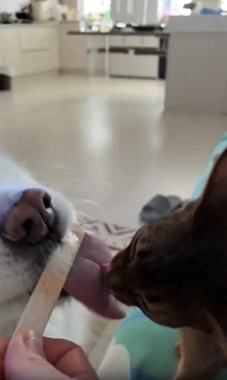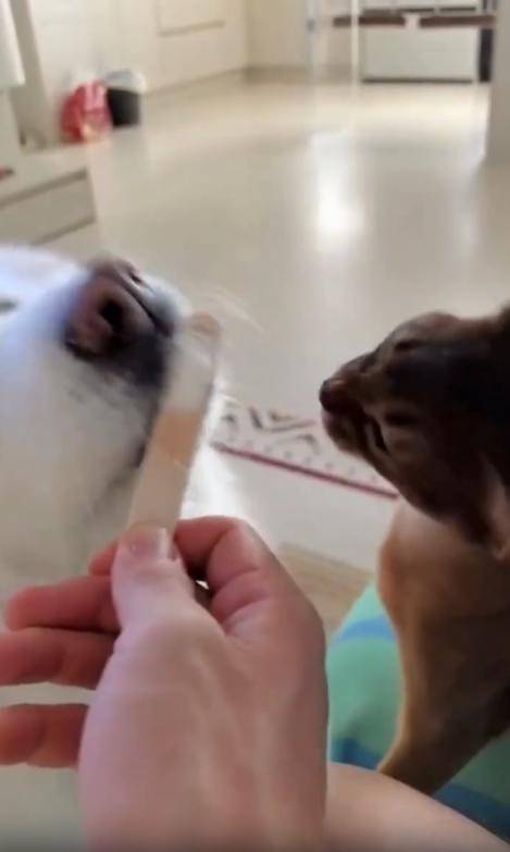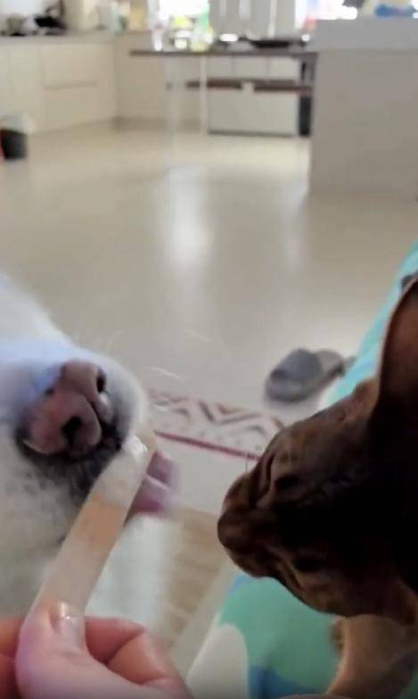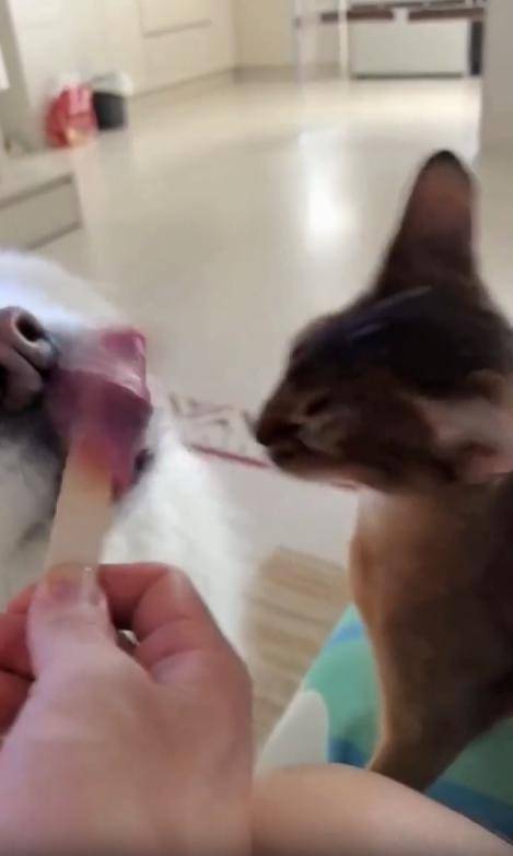 무더운 어느 날, 시원한 막대 아이스크림 하나가 등장했습니다. 그런데 이 아이스크림을 둘러싼 경쟁자는 다름 아닌 강아지와 고양이. 둘은 주인이 들고 있는 아이스크림을 사이에 두고 나란히 선 채 혀를 쭉 내밀며 한입씩 핥아먹고 있었죠.