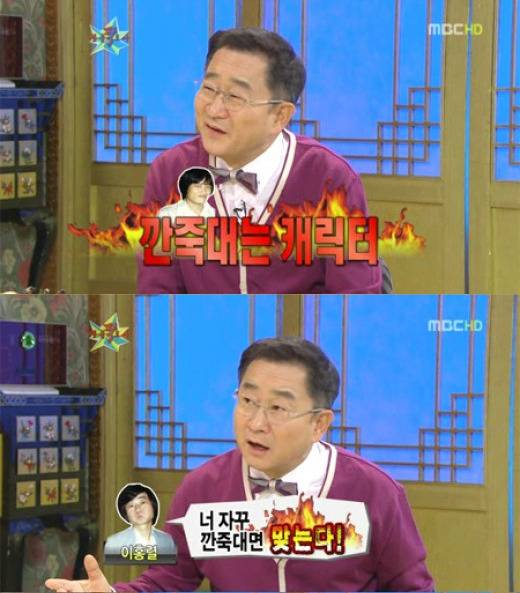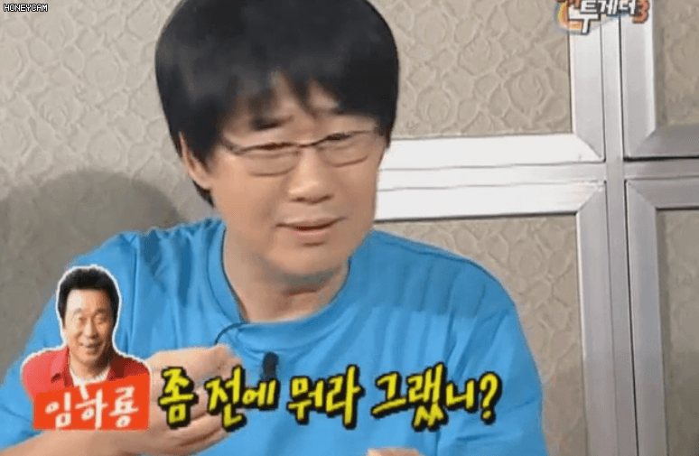 노안으로 유명한 임하룡에게 '노인네'라고 연거푸 놀리며 우유 싸대기를 맞았으며, 주병진과는 야자타임을 하던 중"네가 무슨 개그계의 신사야! 넌 거지 같은 놈이야!"라고 도발해 결국 먹다 남은 족발로 얻어맞았다고 한다.