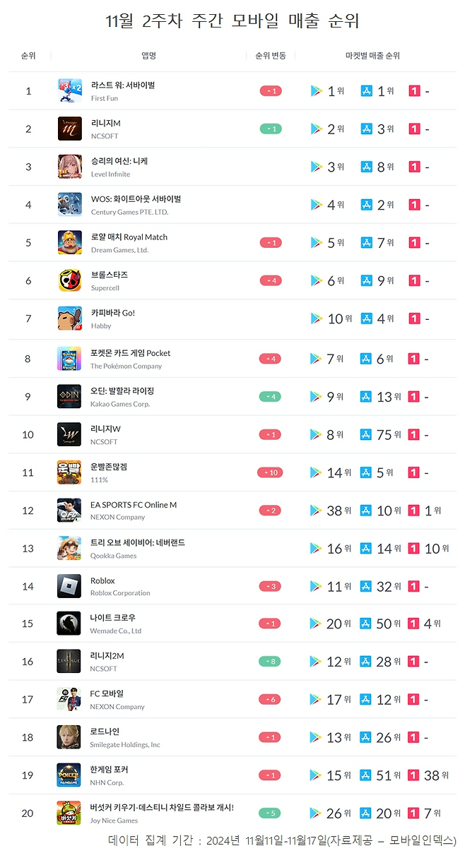 한 주간의 매출 순위를 알아보고 국내 모바일 게임 시장에 어떤 변화가 있었는지 확인하는 '주간모바일순위' 코너입니다. 구글 플레이와 애플 앱스토어, 원스토어 등 국내 3대 마켓에서의 모바일 게임 매출을 합산해 산출한 순위를 통해 매주 모바일 게임 시장 변화를 독자들에게 제공하고자 합니다. <편집자주>