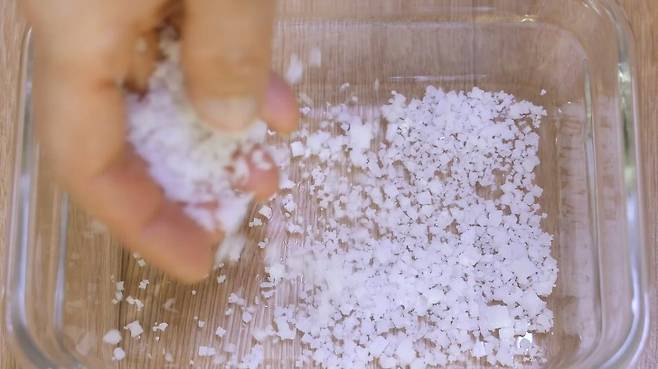 밀폐용기를 준비한 후 소금을 아래 부분에 깔아 주세요. 소금은 습기를 흡수하기 때문에 아래에 깔아 놓으면 깐 마늘을 더욱 오랫동안 보관하실 수 있답니다.