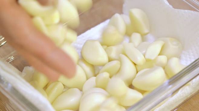 키친타월을 깔고 마늘을 넣고 다시 키친타월로 덮고 뚜껑을 덮으세요.