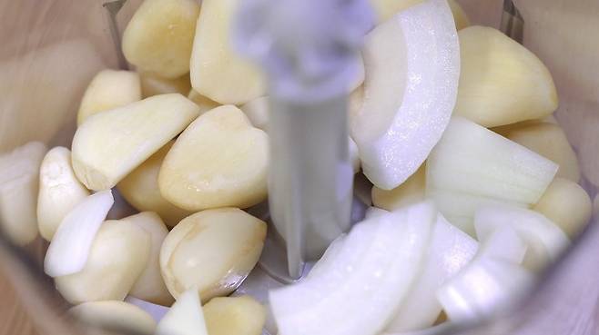 마늘을 다질 때 양파가 마늘향을 해치지 않을 정도로만 넣어 주시면 좋아요.