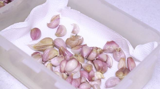 다시 키친타월로 덮고 뚜껑을 닫아 '김치냉장고'에 보관해 두시면 반년도 거뜬! 먹을 수 있는 마늘 보관법이에요.