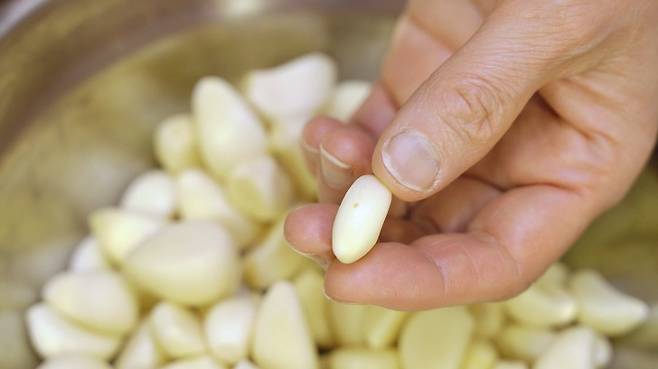 깐 마늘은 방법이 조금 다른데요. 먼저 마늘을 모두 깐 후 썩은 부분이 있다면 제거해 주세요.