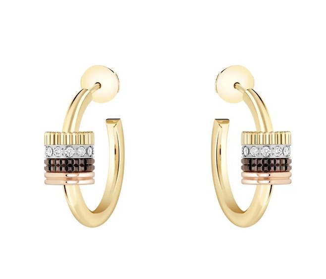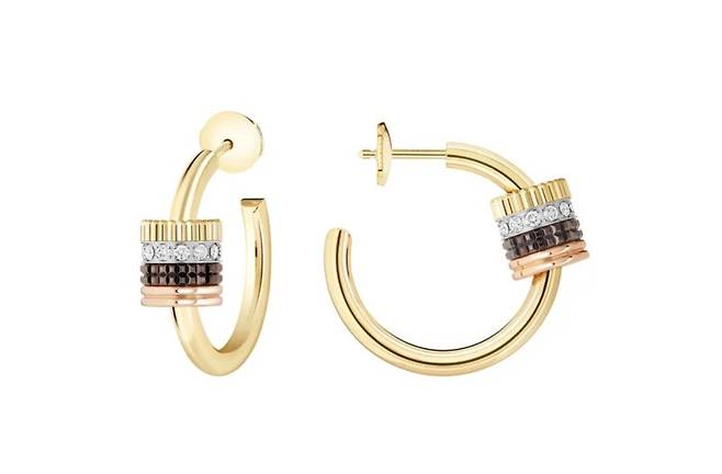 다음으로 목걸이와 완벽한 세트를 이루는 귀걸이를 살펴보겠습니다. 이 제품은 ‘부쉐론 콰트로 클래식 튜브 후프 이어링’입니다. 앞서 소개한 목걸이와 마찬가지로 3가지 골드 컬러와 브라운 PVD가 결합된 디자인이 특징인 후프 이어링입니다. 도시적이면서도 그래픽적인 디자인이 한소희님의 이목구비를 더욱 뚜렷하고 화려하게 만들어주었습니다. 후프 형태이지만 콰트로 컬렉션 특유의 입체적인 디자인 덕분에 어느 각도에서 보아도 독보적인 존재감을 드러냅니다. 심플한 룩에는 확실한 포인트를, 화려한 룩에는 고급스러운 무드를 더해주는 만능 아이템이라고 할 수 있습니다. 데일리로 착용하기에도 부담스럽지 않으면서 특별한 날에는 그 어떤 주얼리보다 빛을 발할 제품입니다.