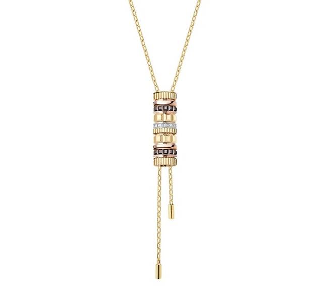 먼저 한소희님의 목선을 우아하게 감싼 목걸이부터 알아보겠습니다. 이 제품은 ‘부쉐론 콰트로 클래식 볼로 타이 네크리스’입니다. 2004년 첫선을 보인 이래 부쉐론의 상징적인 컬렉션으로 자리 잡은 콰트로 라인의 정수를 담고 있는 작품이죠. 이 목걸이의 가장 큰 특징은 네 가지 코드가 조화롭게 어우러져 있다는 점입니다.