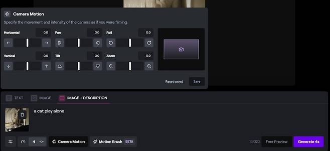 협탁에 올라간 고양이 사진을 넣고 ‘a cat playing alone’을 프롬프트로 넣은 결과물이다. 움직임이 생기고 그림자도 따라 움직인다. 단 아주 간단한 작업임에도 변환 시간이 오래 걸렸는데, 위 프로젝트는 이미지→영상 변환까지 30초 이상이 소요됐다.