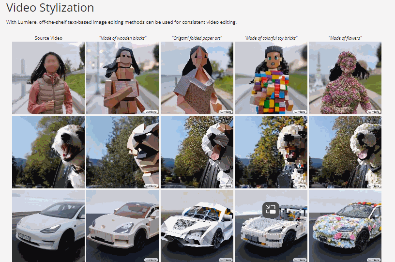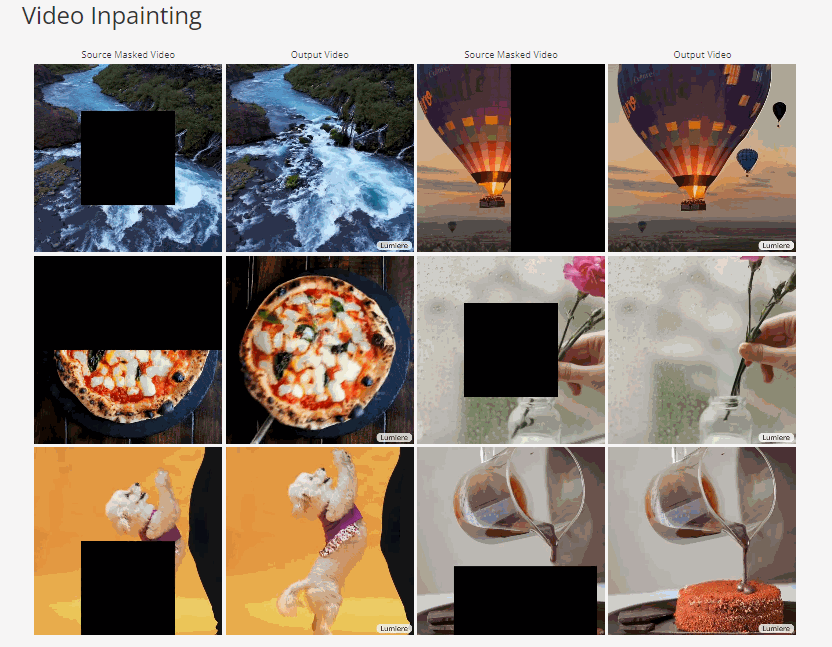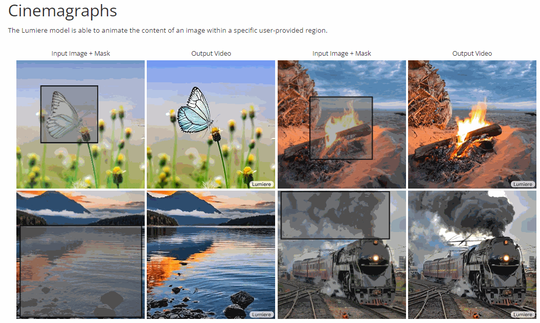 다양한 편집 기능은 루미에르의 가장 큰 장점이다. 텍스트 프롬프트를 비디오로 변환하는 것은 물론이고 이미지의 가려진 부분까지 비디오로 구현해내거나 특정 영역에 애니메이션 효과도 넣을 수 있다.