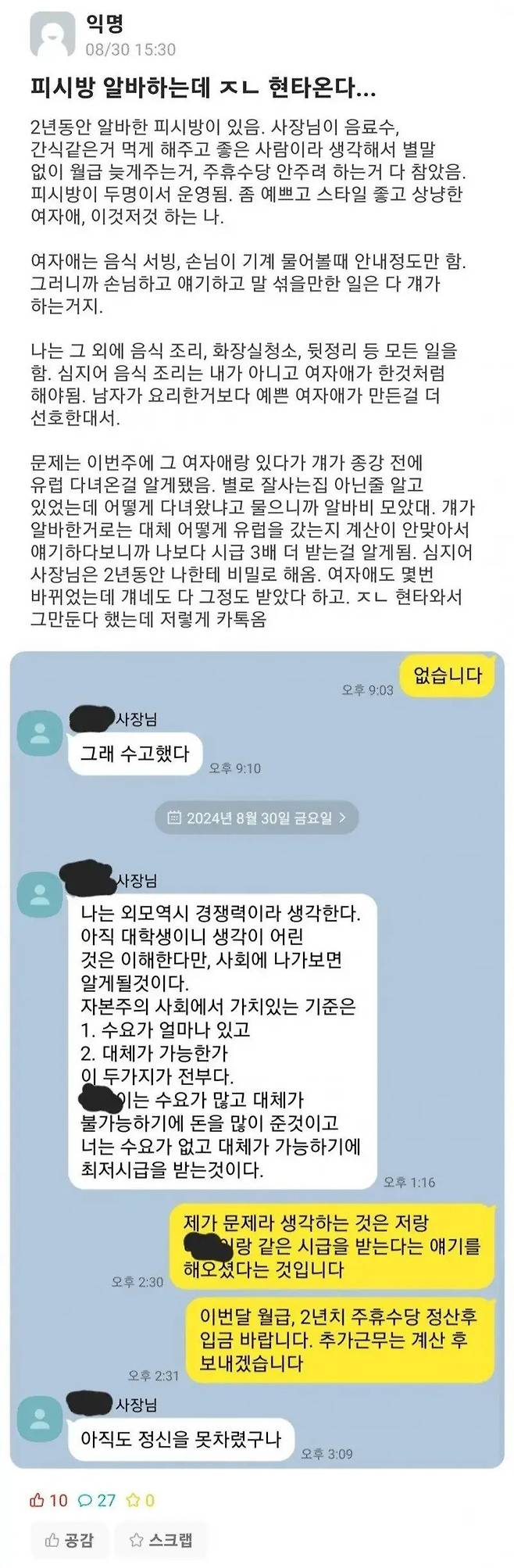 본인보다 시급 3배 더 받는 여자 알바 때문에 빡친 알바생