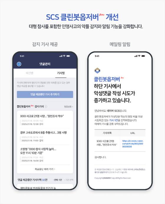 네이버는 24일 블로그 공지를 통해 “1분기 내 인명 사고 보도에서의 악성 댓글 감지 AI 기술을 ‘클린봇 옵저버’에 적용해 고도화 할 예정”이라고 밝혔다. 2023년 베타 서비스를 시작한 클린봇 옵저버는 악성 댓글 작성 시도 비율을 계산해 감지 대상 기사를 자동으로 선별하고, 해당 기사를 언론사에 알려주는 서비스다. 알림을 받은 언론사들은 빠르게 댓글 제공 중단의 필요성을 파악하고 중단을 결정할 수 있다. 악성 댓글을 쓰는 공간 자체를 차단해 2차 피해를 막는다는 취지다. 네이버에 따르면 지난해 연말 발생한 무안 제주항공 참사 당시 약 30개 언론사가 댓글 제공 중단 기능을 이용했다.