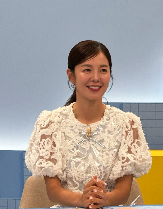 사진 속 김성은은 퍼프 소매 디테일이 돋보이는 화이트 블라우스에 하이웨이스트 데님 팬츠를 매치해 내추럴한 분위기를 연출했다.