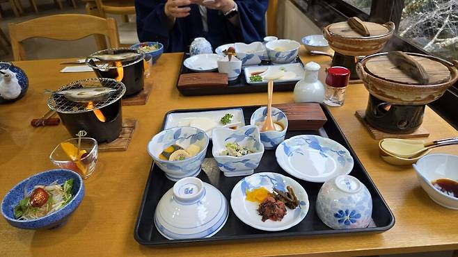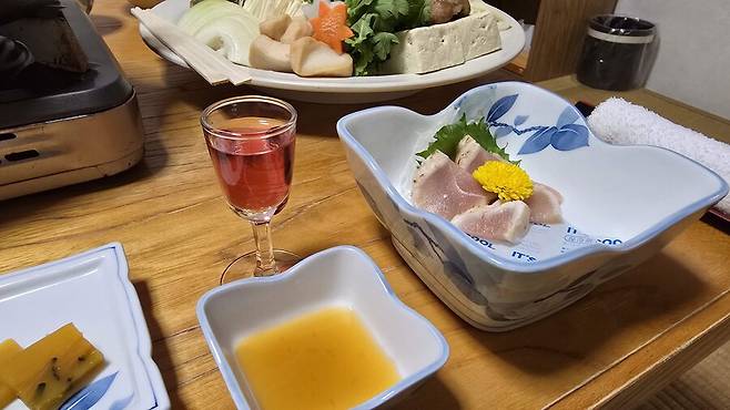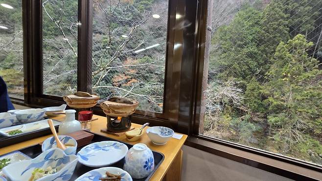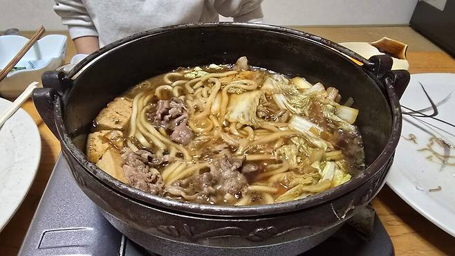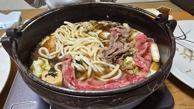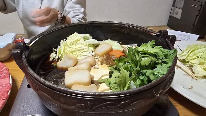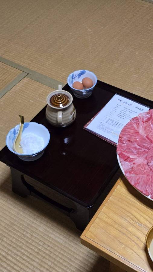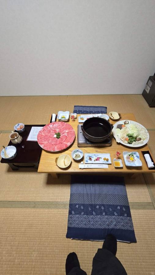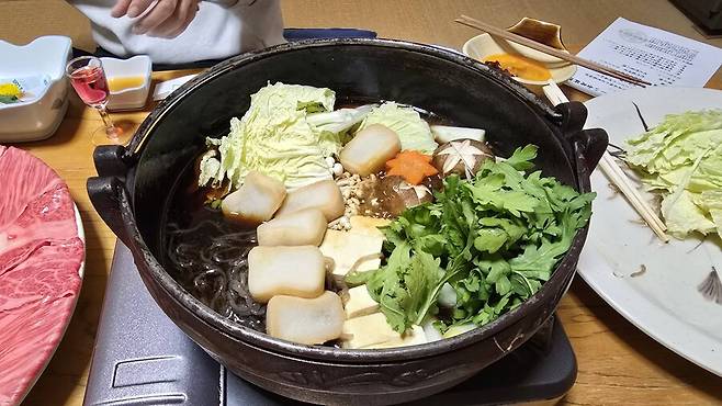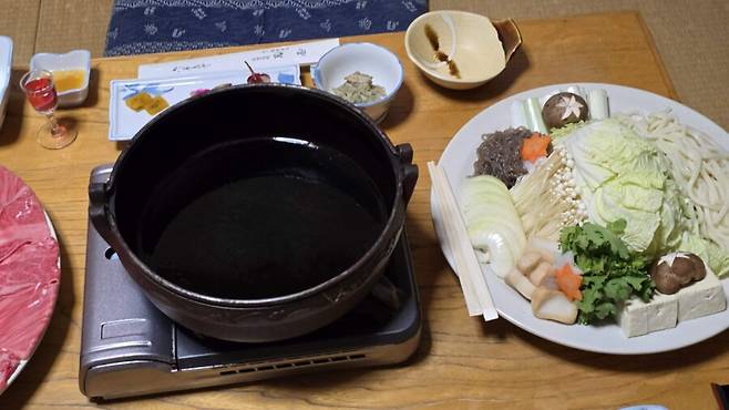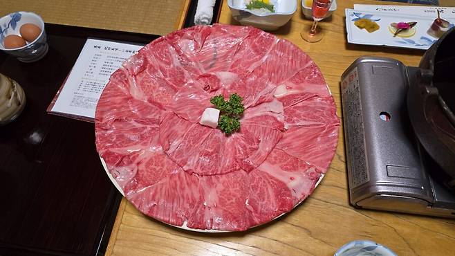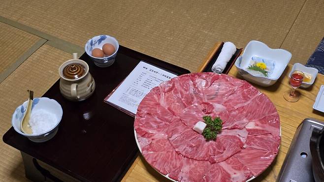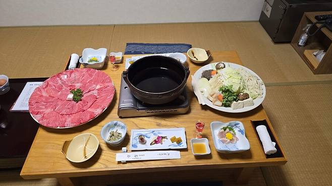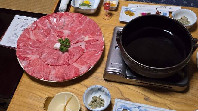 저녁식사는 두달전에 예약한 구마노 지역의 소고기로 만든 간사이식 스키야키 요리였습니다.
