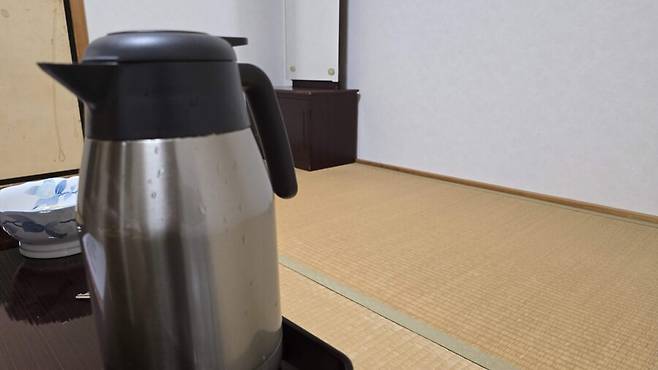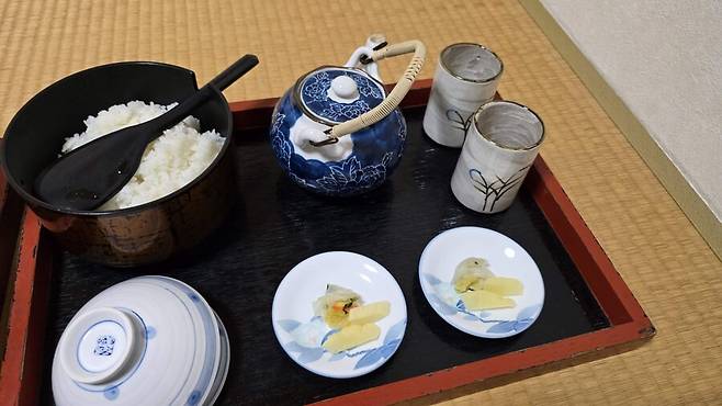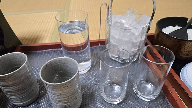 이 료칸만에서 주문 제작하시는 전용 소주 이걸 스트레이트로 마시는게 아니라 찬물로 할건지 아니면