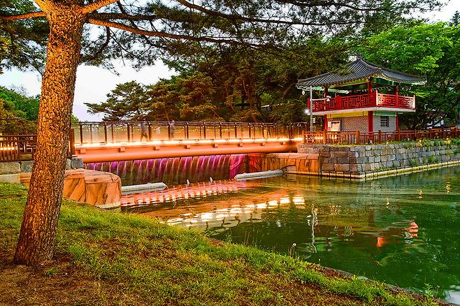 의림지 용추폭포는 낮의 시원함뿐만 아니라 밤이 되면 또 다른 매력을 선사한다. 폭포 주변과 수문 아래는 자연친화적으로 꾸며져 있어 인공적인 느낌 없이 자연 그대로의 풍경을 즐길 수 있다.
