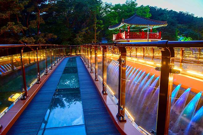 용추폭포 유리전망대는 단순한 투명 바닥의 인도교가 아니다. 바닥 일부는 평소 불투명 유리로 가려져 있다가 사람이 지나가면 투명하게 바뀌는 독특한 설계가 돋보인다.