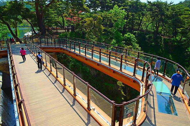 모두가 유리전망대의 아찔함을 즐길 수 있는 것은 아니다. 발밑으로 시원하게 쏟아지는 폭포를 보는 것이 두려운 사람들을 위해, 용추폭포 주변에는 나무 덱도 마련되어 있다.