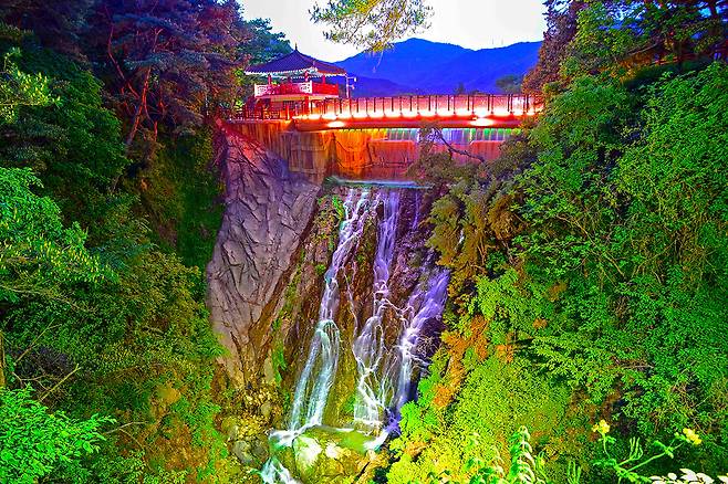 밤이 되면 용추폭포에는 여러 색의 조명이 비춰지며 환상적인 야경이 펼쳐진다. 다양한 색으로 변하는 조명 아래 폭포는 마치 생명을 얻은 듯 빛나고 물줄기는 반짝이는 물보라를 만들어낸다.