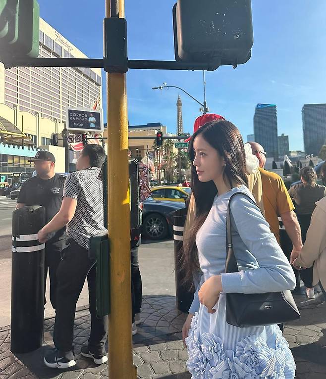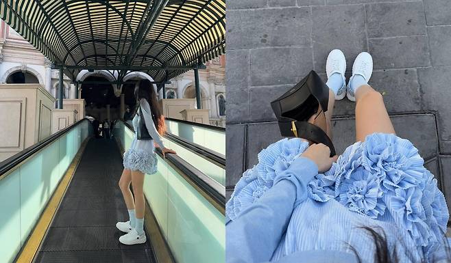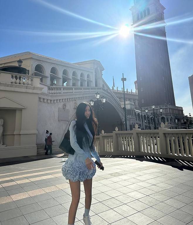 사진 속 배경 역시 이국적인 분위기를 자아낸다. 베네치아풍의 건축물과 따스한 햇살이 어우러지며 마치 유럽의 거리에서 찍은 듯한 감성을 더했다. 효민은 자연스러운 포즈와 미소로 한층 더 여유로운 분위기를 연출하며 패션의 완성도를 높였다.