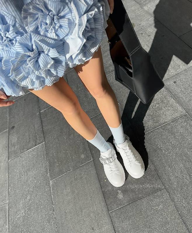 특히, 짧은 길이의 벌룬스커트는 그녀의 늘씬한 각선미를 더욱 돋보이게 했다. 니삭스와 화이트 스니커즈를 매치해 스타일링에 캐주얼한 터치를 더하면서도 다리 라인을 길고 슬림하게 보이도록 연출한 점이 돋보인다.