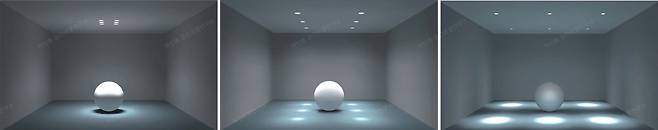 같은 크기의 공간에 같은 조명기구 6개가 설치했지만 각 광원의 밀집도에 따라 공간 가운데 놓인 오브제의 존재감은 전혀 다른 것을 볼 수 있다. 조명의 밀집도를 조절하는 것만으로 왼쪽의 그림처럼 대상의 입체감을 더욱 강하게 돋보이게 할 수도 있고 반대로 부드럽게 인식하도록 할 수도 있으며 오른쪽 그림처럼 마치 사라진 것처럼 그 존재감을 거의 느껴지지 않도록 할 수도 있다.