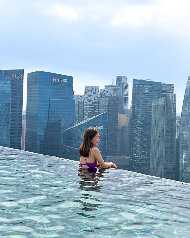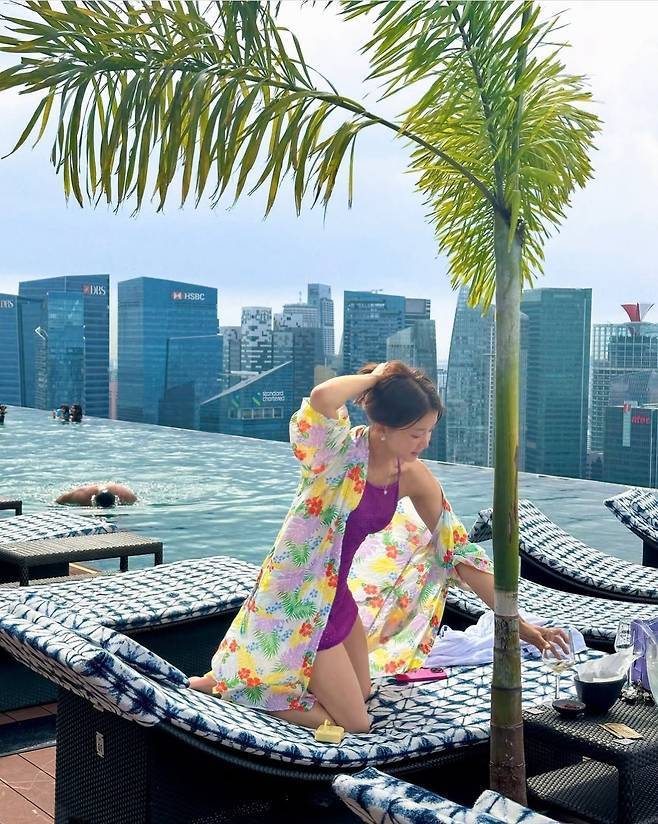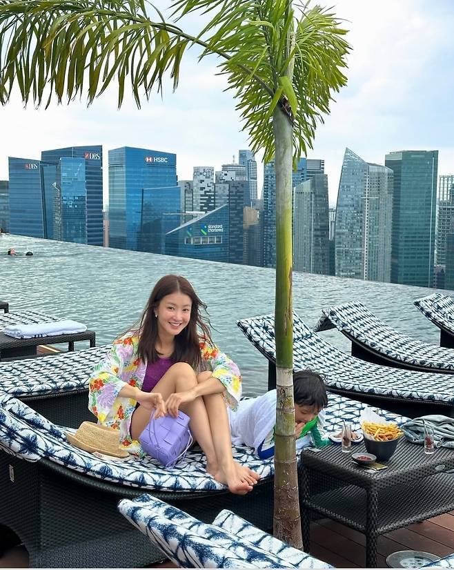 이시영은 보라색 홀터넥 미니원피스 수영복을 입고 아들과 함께 여유로운 시간을 즐겼습니다.