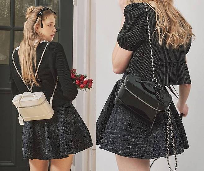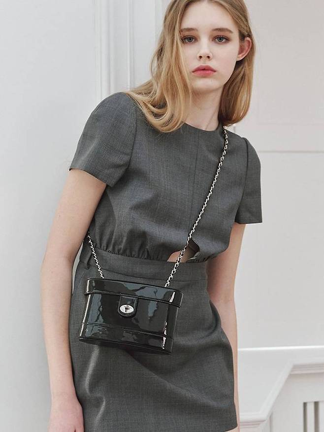 가방의 스트랩은 가죽이 믹스된 고급 코팅 실버 체인으로 제작되어 세련된 느낌을 더했으며 바디는 선명하고 투명한 광택이 특징인 글로시 페이던트 가죽으로 제작되었다.