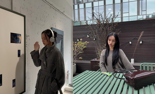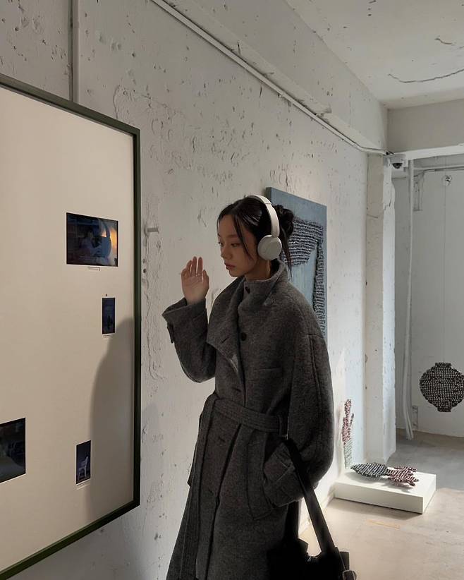 첫 번째 사진에서 혜리는 차분한 그레이 컬러의 롱 코트를 착용해 세련된 분위기를 연출하고 있다. 벨트 디테일이 허리를 강조하며, 전체적으로 단정하면서도 우아한 실루엣을 완성했다. 헤드폰을 착용한 모습은 현대적인 감각을 더하며, 예술 작품과 자연스럽게 어우러지는 감각적인 스타일링이 돋보인다.