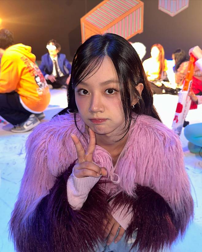 핑크와 버건디 컬러가 조화를 이룬 퍼 재킷으로 화려함을 강조했다. 풍성한 텍스처와 강렬한 색감이 시선을 사로잡으며, 무대 위에서 돋보이는 스타일링이다. 손가락으로 브이(V) 포즈를 취하며 귀여운 매력을 더해 전체적인 룩에 활기를 불어넣었다.