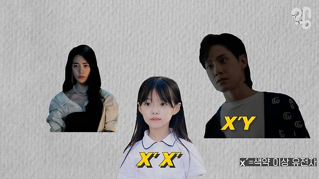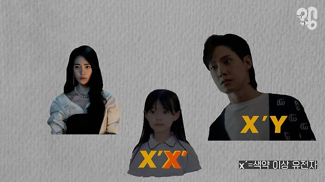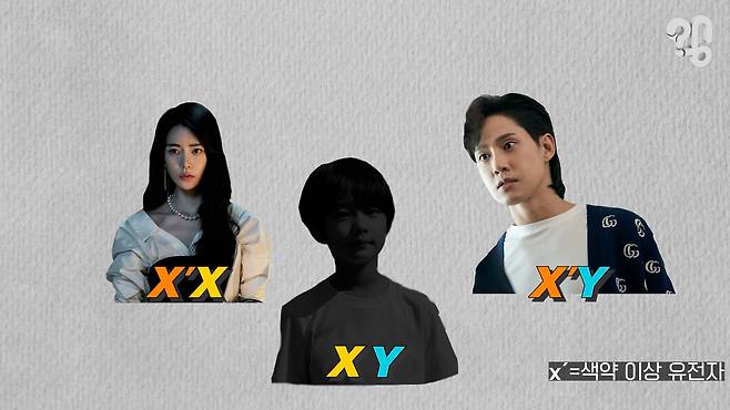 여기서 두 가지 질문이 나올 수 있다. 첫째, 하예솔이 전재준에게서 물려받은 x유전자 외에 다른 x유전자도 색약 유전자라면 엄마인 박연진의 경우는 어떨까? 드라마에서 박연진은 색약증상이 없는데 이런 경우에 ‘보인자’라는 표현을 쓴다. 보인자는 증상 발현은 없지만 이상 유전자를 하나 갖고 있는 것을 의미한다. 여기서 포인트는 ‘발현’되지 않는다는 것.