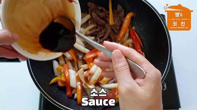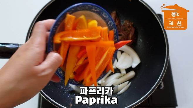 채 썬 양파와 피망을 넣어주세요