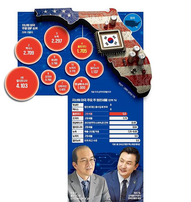 미국 플로리다주의 지난해 국내총생산(GDP)은 1조7050억달러다. 캘리포니아, 텍사스, 뉴욕에 이어 미 50개 주 중 4위에 올랐다. 세계 순위로 환산하면 15위인 스페인 GDP와 비슷하다. 내수를 뒷받침하는 인구도 많다. 지난해 말 기준 2337만 명으로 50개 주 가운데 3위다. 최근 2년간 유입된 인구는 46만7374명으로 2년 연속 증가율 1위였다. 케이프커내버럴 우주군 기지 등을 보유해 우주 방위산업의 본거지로도 불린다. 최근에는 벨기에 아이멕 등 세계적 반도체 연구소와 관련 기업을 유치하며 반도체 클러스터 ‘네오시티’를 건설하고 있다.