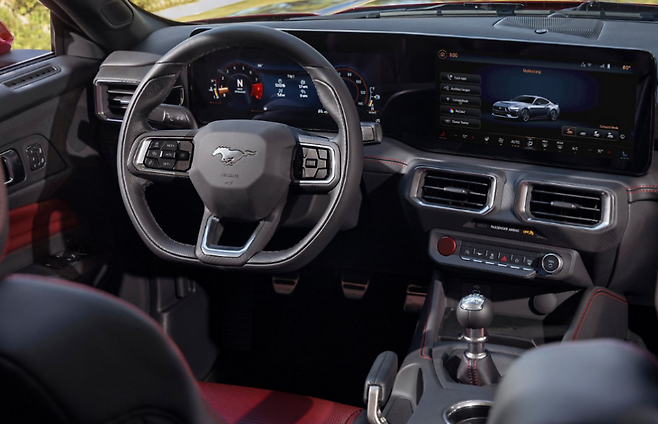 또한 실내 공간에 큰 폭의 업데이트가 감지된다. 이번 세대변경, 7세대 올 뉴 머스탱을 통해 이전 세대와는 또 다른 인테리어 분위기를 선사하는데, 특히 전투기 조종석에서 영감을 받은 2개의 유동적이며 곡면형 디자인의 대형 디지털 디스플레이를 새롭게 적용했다.