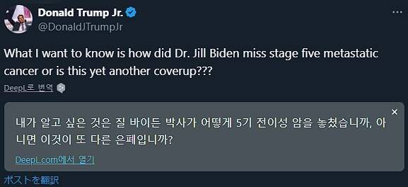 그 아들인 도널드 트럼프 주니어는 X에 "질 바이든은 박사라며? 그런데 어떻게 5기 암을 놓친 거야?" 라는 비난 글을 올림
