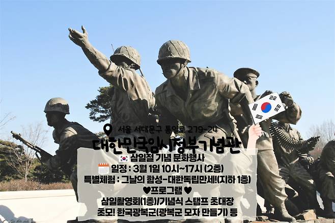 행사에는 퀴즈, 퍼즐, 무궁화 손편지 쓰기 등의 가족 단위 프로그램과 독립 기념사진 찍기, 삼일절 기념식 초대장 만들기, 광복군 모자 만들기 등의 활동적인 체험 프로그램이 포함됩니다.