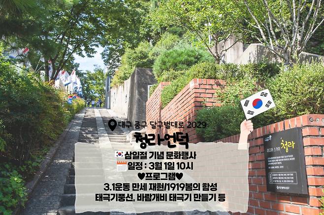 또한, 청라언덕에서는 '태극기 풍선'과 '바람개비 태극기 만들기', 계산예가에서는 '소원 태극기 달기'와 '포토존' 프로그램이 준비되어 있으며, 서상돈 고택 앞에서는 국악 밴드 '이상국악 앙상블 리뉴얼'의 공연이 펼쳐질 예정입니다.