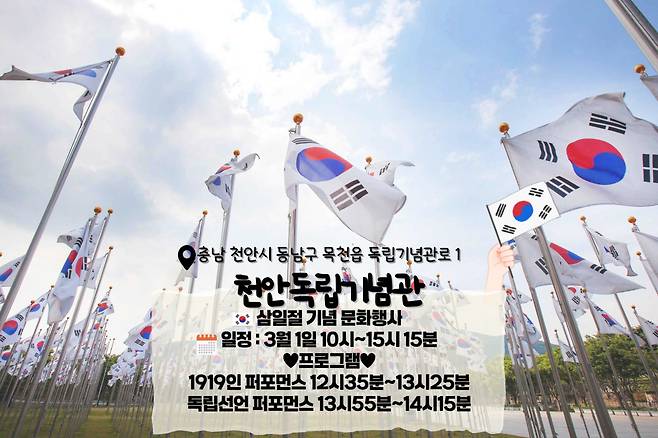 오전 10시 30분에 삼일절 기념식이 시작되며, 오전 10시부터 오후 6시까지 다양한 체험 프로그램과 독립선언서 낭독, 독립운동 재현 퍼포먼스, 한복 3·1운동 플래시몹 등이 펼쳐집니다.