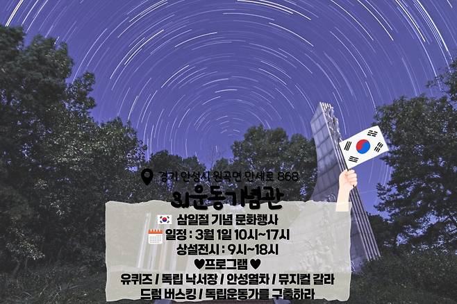 이 외에도 안성의 독립운동가 최은식 선생을 홍보하는 에코백 만들기, 미서훈 독립운동가 훈장 만들기, '해' 스티커북 꾸미기 등의 체험 활동도 진행됩니다. 이번 행사는 안성 3.1운동의 역사를 이해하고 그 의미와 가치를 되새기는 뜻깊은 시간이 될 것입니다.