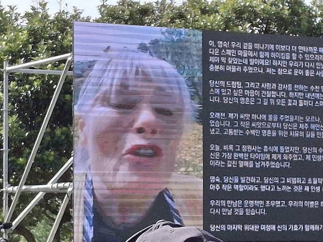 | ▲ '헤니'의 영상편지 서명숙이 산티아고 순례길에서 영국 여성 '헤니'와 만나 "돌아가면 서로의 길을 내자"고 약속한 게 제주올레길이 만들어진 계기가 됐다. 지난 2월 헤어진 지 20년 만에 극적으로 재회했던 ‘헤니’ 씨가 보내온 영상편지가 영결식장을 숙연하게 만들었다. |