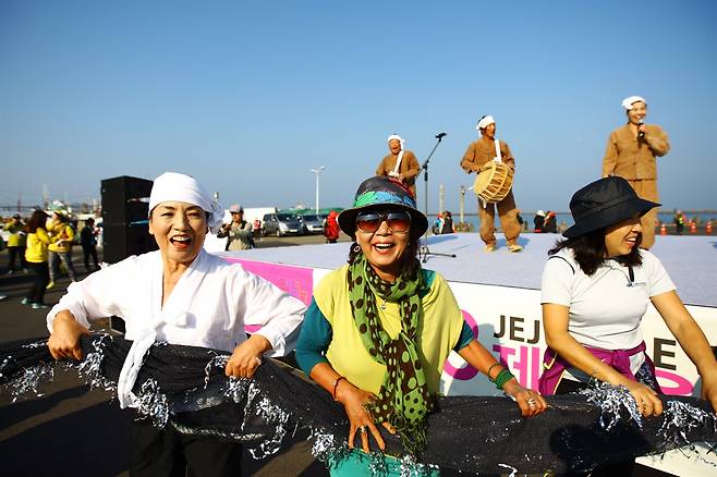 | ▲ 서명숙 제주올레 이사장은 늘 사람들과 함께 어울리며 먼저 걷기축제에 스며들었다. 맨 왼쪽이 안은주 대표, 바로 옆이 서명숙 이사장. |