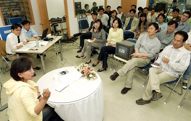 | ▲ 서명숙 <오마이뉴스> 편집국장 내정자와 편집국 차장급 이하 평기자들이 2005년 4월 15일 밤 '100분토론'을 하고 있다. |