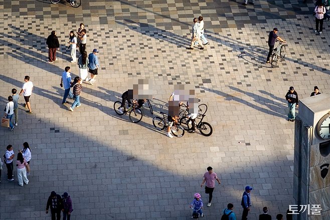 | ▲ 지난 2025년 5월, 광주광역시 5.18 민주광장에서 청소년들이 무리지어 픽시를 타고 있다. |