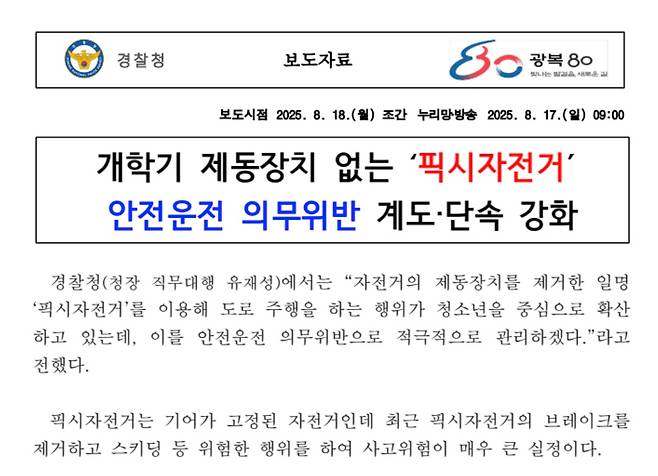 | ▲ 경찰청의 픽시 단속 강화 보도자료. |